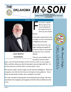 The magazine does not accept advertising. If you wish to submit an article to be considered for publication, please e-mail it to the at Editor or mail to Publications Editor, Grand Lodge of Oklahoma, P.O. Box 1019, Guthrie, OK 73044.